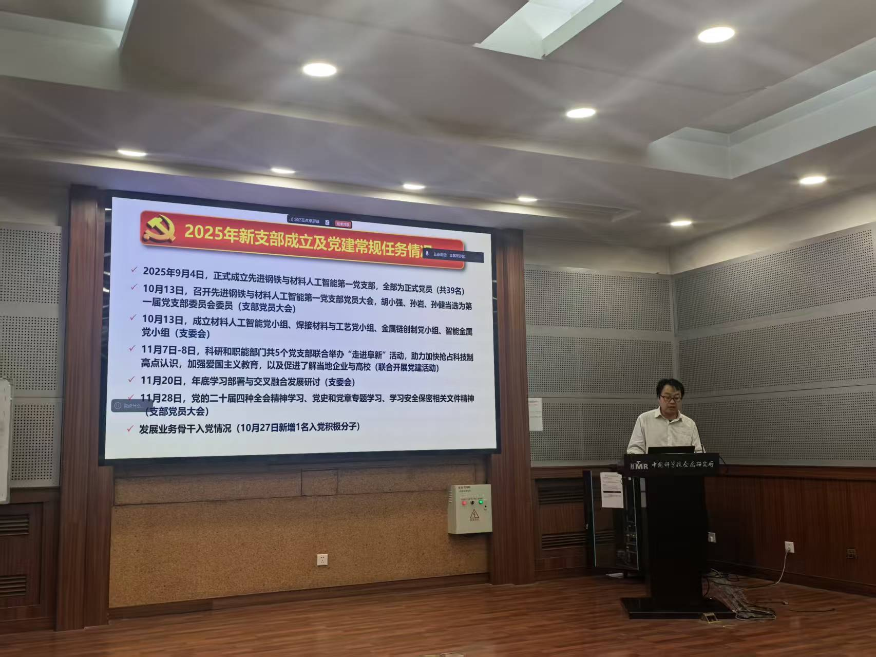 胡小强也向全体与会党员详细介绍了支部党员构成信息图,列出了39名党员的研究方向、所属党小组及人才梯队情况,从支部党员构成可以看出所在部门人才队伍建设呈现出跨材料、人工智能、工艺与制造等多学科交叉融合的鲜明特色,展现了良好的人才储备态势。会议强调,支部将按照党管人才原则,持续关注党员个人发展与人才队伍建设,鼓励不同年龄段党员同志找准定位、明晰发展路径,在重大任务攻关和各类人才计划申报中互帮互助、协同共进。