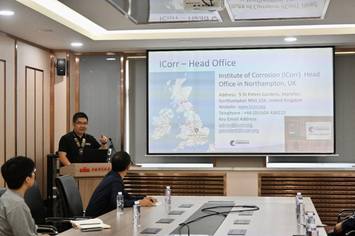 应金属所材料腐蚀与防护研究部和辽宁省腐蚀与防护学会理事长郑玉贵研究员的邀请,英国腐蚀学会会长高云男博士于9月25日访问了金属所并作了题为“Introduction to the Institute of Corrosion (ICorr)”、“Corrosion Management in Oil and Gas Production Facilities from a UK Operator’s Perspective”的学术报告,介绍了英国腐蚀学会的概况和英国油气工业腐蚀管理措施。会后参观了相关实验室,并详细探讨了未来合作的可能性。