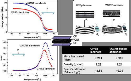 Figure 1. Dynamic mechanical analyses of the carbon-fiber/epoxy (CF/Ep) laminate and the vertically-aligned carbon nanotube (VACNT) sandwich in a three-point bending mode, revealing that the VACNT sandwich (blue triangle) exhibits higher storage modulus and better damping properties (higher energy dissipation during cyclic deformations) than the CF/Ep laminate (red circle) due to the vertical alignment of CNTs and the resulting remarkable reinforcement of shear modulus. Moreover, the VACNT sandwich exhibits lower mass fraction of fillers, lower density, and higher specific stiffness than the CF/Ep laminate. (ACS Nano 2010, 4, 6798-6804)