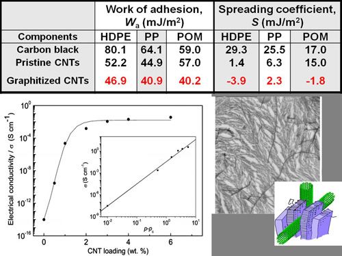 Figure 2. Weak interactions between the graphitized CNTs and polymer, resulting in the unwrapped-CNTs existing among micro-fibrils of polymer spherulites and consequently the low percolation threshold of 0.5 wt% for the CNT/polyoxymethylene composites. . ( Carbon 2011, 48, 3551-3558.)