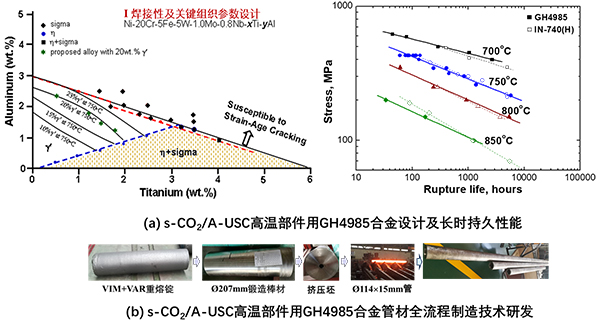 图1 四代核能系统用铁素体/马氏体钢研制及工程化制造技术 (2) 超临界CO2系统和先进超超临界机组用GH4985镍基合金研制 以高温持久性能、焊接性和冷热成形性能为核心,提出了自主知识产权的新型镍基变形合金GH4985;通过冶炼、锻造、热挤压、冷轧工艺试验,形成了GH4985合金关键制备共性技术;完成了合金组织稳定性、短时拉伸性能、长时蠕变性能、焊接性能、模拟服役环境的s-CO2和s-H2O腐蚀行为研究,合金在700-800oC具有良好的强韧性和耐蚀性,综合性能达到先进水平。