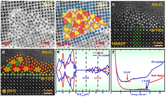 图2. (a, b) MgO一维晶体沿其周期性排列方向的ABF像,(c, d) Nd2O3一维晶体的HAADF像,(e, f) DFT理论计算与STEM-EELS测定MgO一维晶体的带隙。