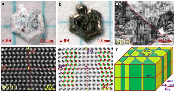 图3. (a) h-BN单晶,(b) 合成的w-BN晶体,(c) w-BN中高密度的层错和倒反畴界,(d, e) 层错-倒反畴界结的HAADF和ABF像,(f) 层错和倒反畴界构成面缺陷三维网络的示意图。