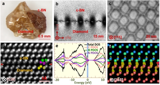 图4. (a) 金刚石∕立方氮化硼异质结,(b) 界面的截面样品TEM像,(c) 界面上层错网络的STEM明场像,(d) 界面的HAADF像,(e, f) DFT计算表明该界面上形成了二维电子气。