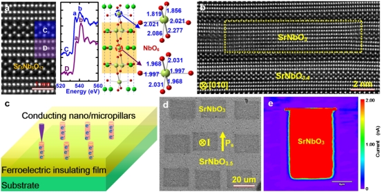 图5. (a) 准一维金属导电性起源的物理机制,(b) 利用电子束辐照在原子尺度精确控制SrNbO3.4的相变,(c-e)构筑具有一维导电性与二维铁电性的SrNbO3/SrNbO3.5多功能薄膜。