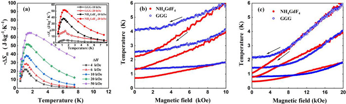 图 1. NH4GdF4 的极低温磁制冷性能。(a)磁熵变 -ΔSm曲线;(b)NH4GdF4 和 GGG 在 10 kOe磁场下从不同初始温度(1.8、4.0和6.0 K)的准绝热退磁冷却曲线;(c)NH4GdF4 和 GGG 在20 kOe磁场从不同初始温度(1.8、4.0和6.0 K)的准绝热退磁冷却曲线。