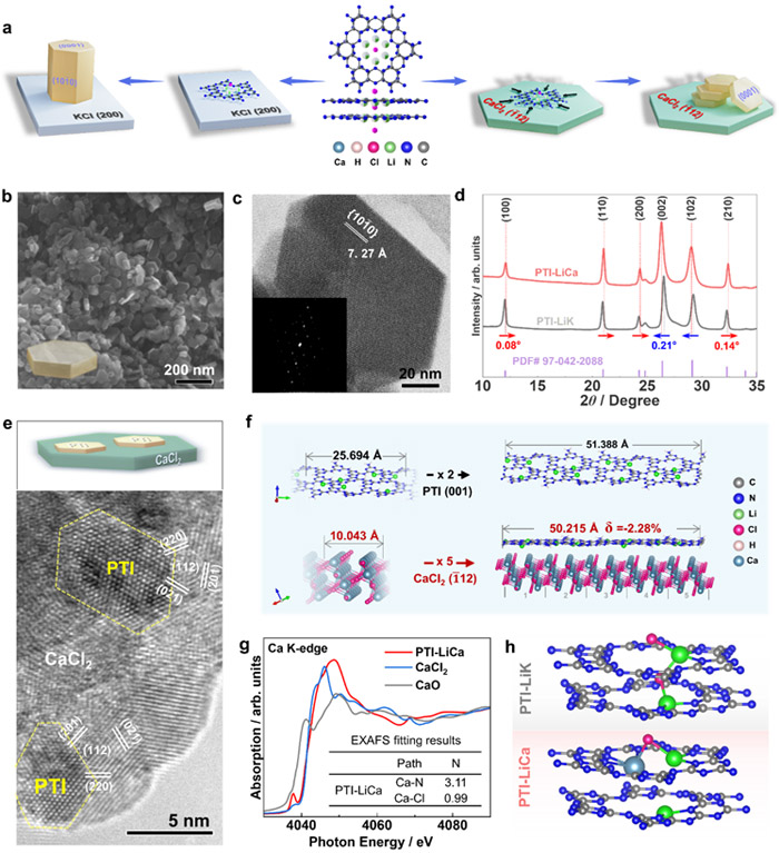 针对上述挑战,中国科学院金属研究所沈阳材料科学国家研究中心太阳能与氢能材料研究团队提出了一种通过晶格工程实现PTI中激子自发解离的策略。具体地,将制备聚三嗪酰亚胺常用的碱金属氯化物熔盐(LiCl/KCl等)替换为碱土金属氯化物熔盐(LiCl/CaCl2),以与PTI原子面晶格失配的