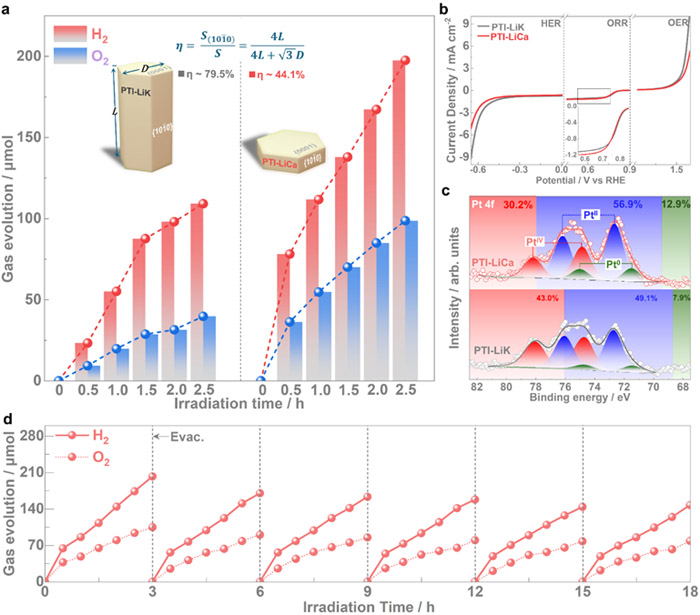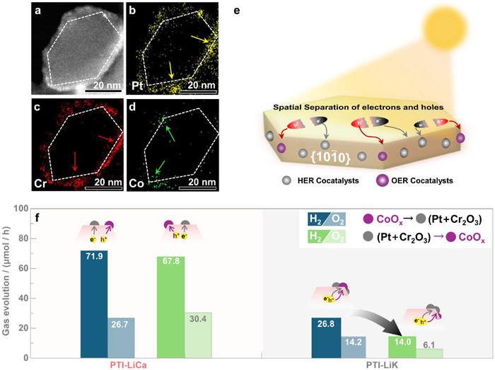 晶面替换KCl (200)晶面作为PTI形核、生长模板,制备出以面内晶格收缩和晶格内掺杂Ca2+为特征的PTI纳米盘(称为PTI-LiCa)。晶格收缩提高了碳氮骨架上能态离域性,Ca2+掺杂则诱导能态的非均匀分布;得益于二者共同作用,PTI-LiCa的激子结合能为15.4 meV,明显低于室温热波动能(25.7 meV)。飞秒瞬态吸收光谱以及皮秒太赫兹光谱等一系列超快光谱表征技术,共同证实PTI-LiCa中光生激子可自发解离为自由电荷。理论模拟手段揭示了载流子特性的内在转变机制。此外,光沉积实验表明,PTI-LiCa中光生电子与空穴发生了各向异性迁移,氧化和还原位点实现了空间分离。得益于此,与利用LiCl/KCl熔盐制备的PTI相比,PTI-LiCa光催化剂的光催化整体水分离活性提高了3.36倍。
