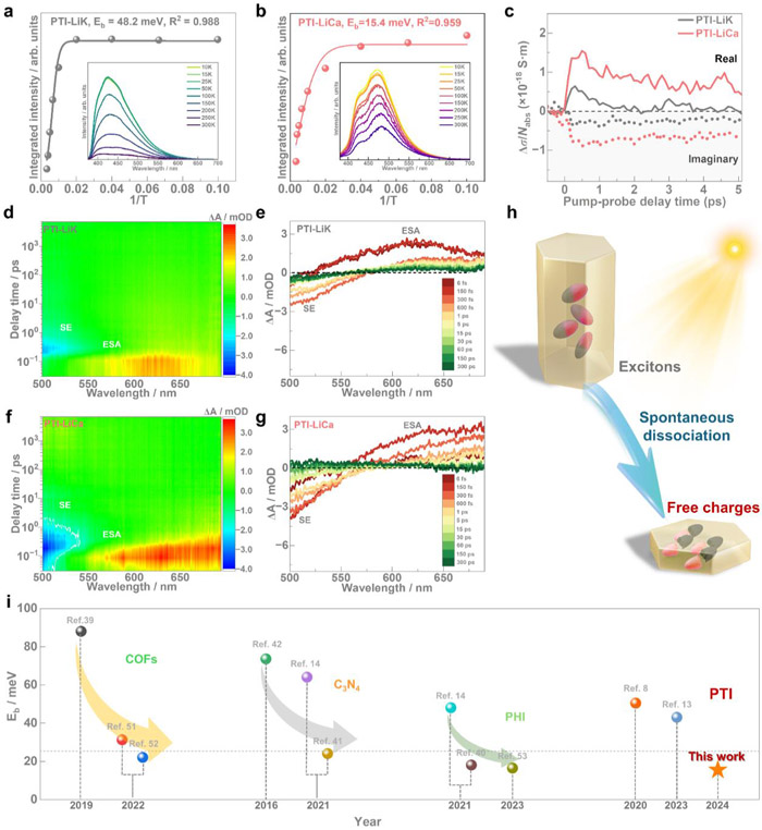 图3. PTI-LiCa中光生激子自发解离为自由电荷的实验证据