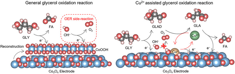 甘油氧化作为生物质平台分子增值的重要途径,其氧化产物广泛应用于制药、食品、化妆品和纺织等行业。然而,传统热催化甘油氧化过程依赖高温高压的反应条件,使用有毒氧化剂和溶剂,污染大、能耗高,限制了其可持续发展。面对国家“双碳”战略目标及绿色发展的迫切需求,电催化甘油氧化(GOR)技术应运而生。该技术以水为氧化剂,以绿色电能为能量输入,不仅为甘油绿色氧化升级提供了新路径,还可替代电解水制氢过程中的高能耗析氧反应,降低系统能耗,实现在生产高值化学品的同时高效制备绿氢,具有显著的科学研究价值与应用前景。
