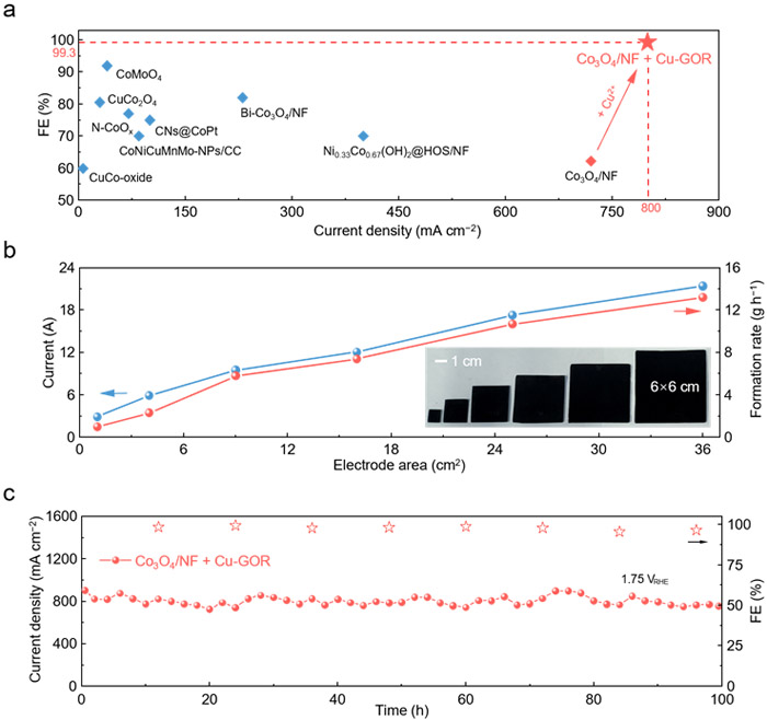 针对该挑战,中国科学院金属研究所太阳能与氢能材料研究团队提出了一种通过引入Cu2+抑制过渡金属氧化物表面非晶化的新策略(Cu-GOR)。相关研究结果表明,在电解液中添加微量Cu2+(相当于反应物浓度的1%),利用Cu2+/Cu+在电催化氧化过程中的可逆氧化还原,可有效维持催化材料晶体结构的稳定性,抑制过渡金属氧化物催化材料的表面非晶化过程。以泡沫镍负载Co3O4催化材料为例,在800 mA cm−2的工业级电流密度下,Cu2+的引入使目标产物甲酸的法拉第效率从62.2%提高至99.3%,性能显著优于已报道的催化材料。同时,该催化材料和反应体系易于放大,6×6 c㎡电极材料的甘油氧化产物收率达到13.2 g h−1,稳定性超过100小时。该策略还可扩展至其他过渡金属氧化物(如镍基材料)及多种生物质电氧化反应体系(如5-羟甲基糠醛电氧化),为推进生物质电催化技术在绿色氢能产业中的应用提供了新思路。