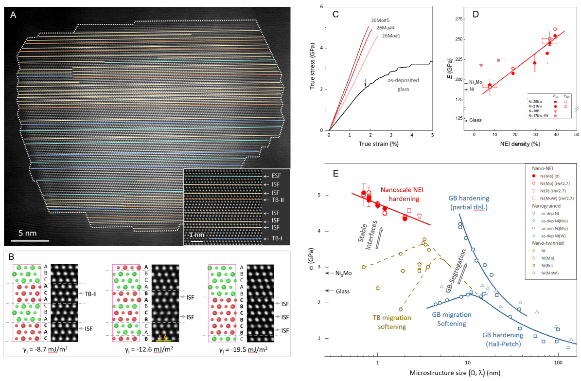 图 通过在镍基过饱和固溶体合金中构筑极高密度稳定的“负能界面” (A, B), 有效阻碍位错及界面运动,完全抑制塑性变形,显著提升杨氏模量(C, D),提升材料强度接近理论极限。