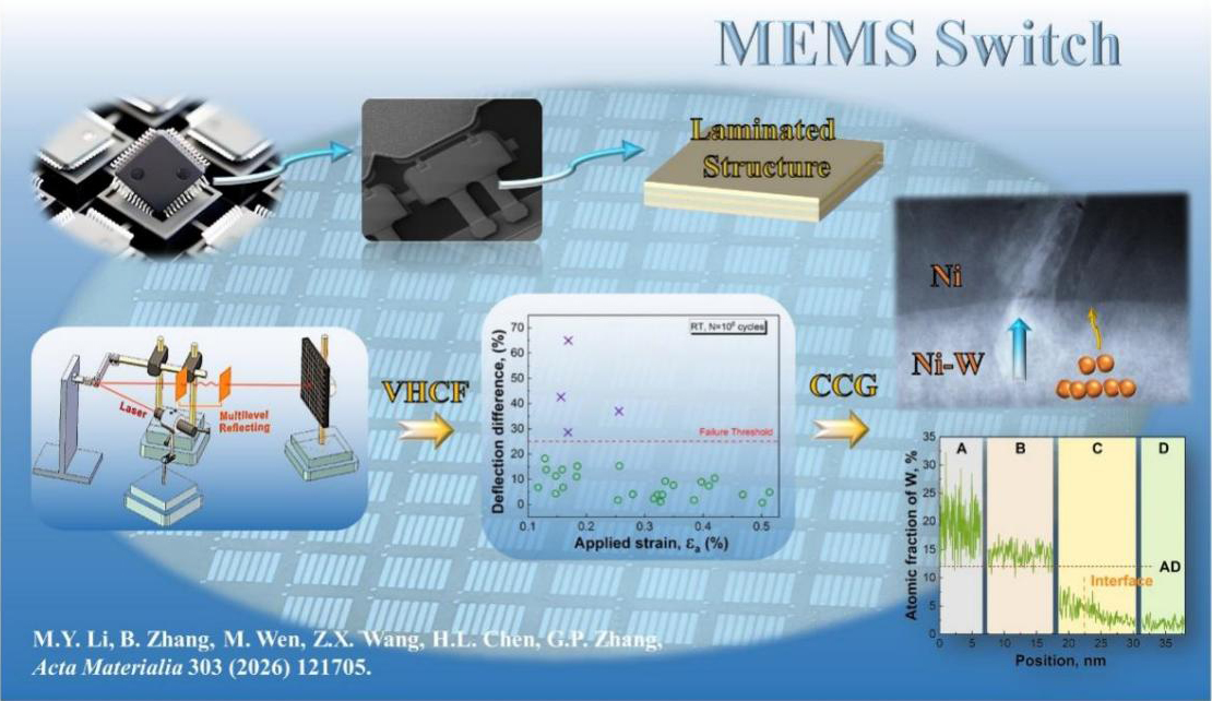MEMS(微机电系统)开关芯片广泛应用于5G/6G通信、航空航天、工业控制及新能源等领域。作为核心元件之一,其微悬臂梁开关不仅需要具备优异的导电性和高强度,还需在实现“开”与“关”状态切换时承受高达1010次超高周循环的动态弯曲变形。微悬臂梁材料能否在超高周疲劳载荷下保持高服役可靠性是制造高功率、低功耗高端MEMS开关芯片的关键挑战之一。虽然金及其合金凭借低电阻率和良好的可微加工性被广泛用于微悬臂梁开关,但其较低的拉伸强度和疲劳抗力无法满足超长疲劳寿命的要求。因此,如何发展高性能开关用微悬臂梁金属材料的设计新原理与新技术,已成为业界亟需解决的关键问题之一。