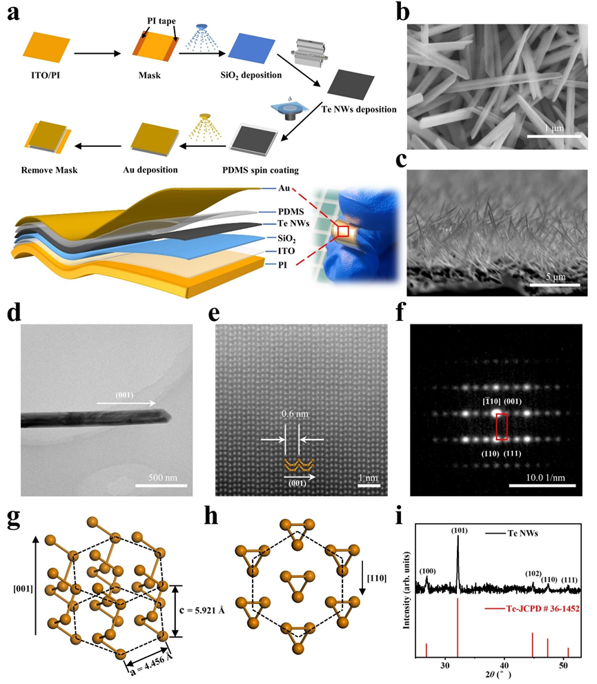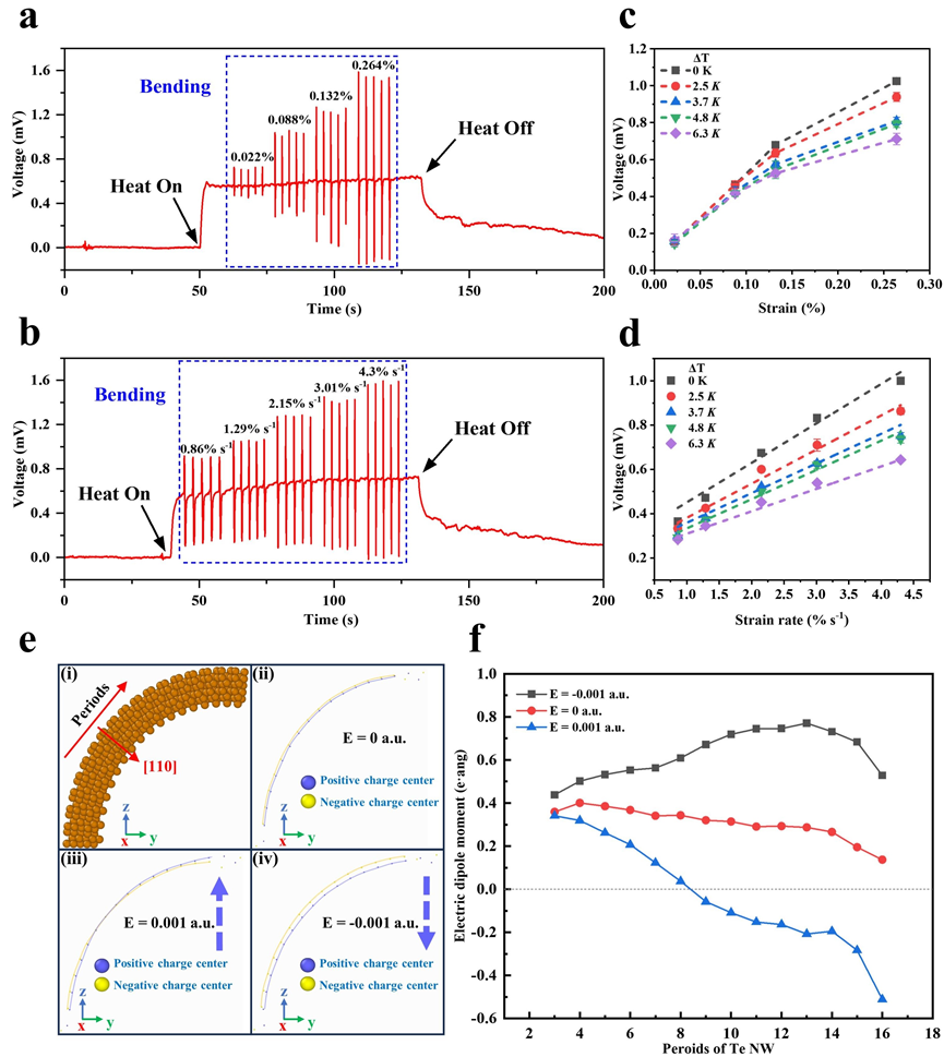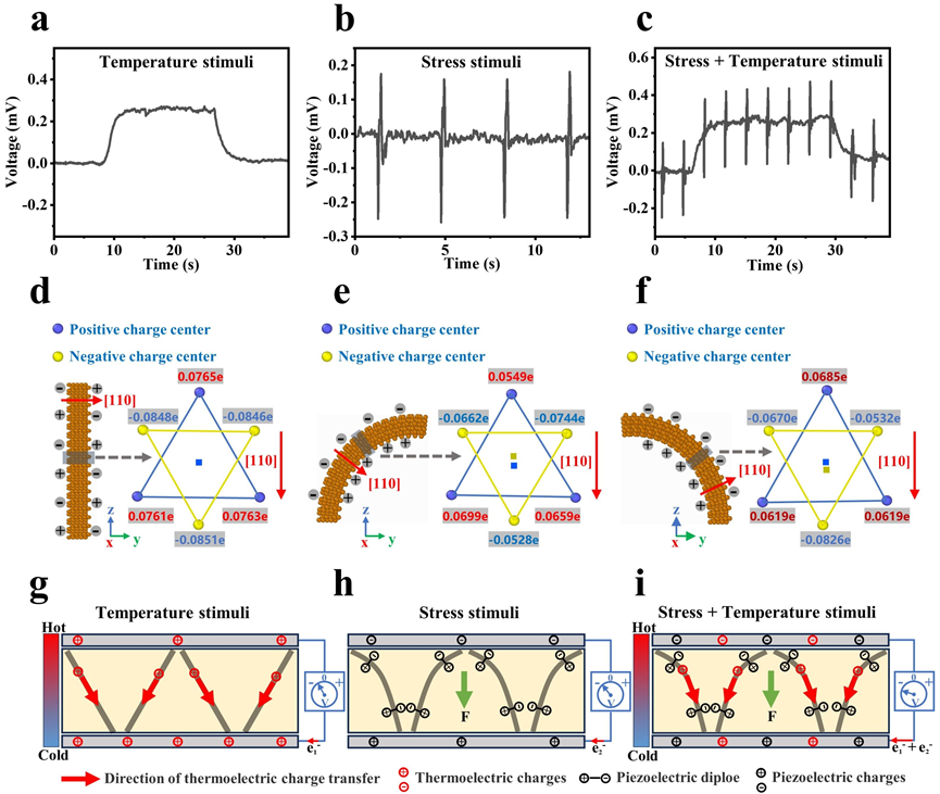 近期,中国科学院金属研究所沈阳材料科学国家研究中心邰凯平研究员带领团队研制出一种基于碲纳米线(Te-NWs)热电-压电耦合效应的柔性、单通道、应变/应变率-温度多模态传感器。研究人员通过材料调控和结构设计克服了以往传统热电材料中热电和压电信号无法在同一方向获得的难题,在倾斜生长的特殊网状Te-NWs结构中,实现了压电信号和热电信号在面外方向的同时感知和输出。传感器具有优异的性能,应变传感灵敏度为0.454 V、应变率传感灵敏度为0.0154 V s、温度传感灵敏度达 225.1 μV K-1,优于已报道的同类多模态传感器。同时,结合第一性原理计算,证明了Te原子电荷的变化引起的压电效应,以及外部电场(如热电势等)对于压电信号的调制作用机制。该工作为基于多物理场耦合效应构建柔性、单通道、多模态传感器提供了新思路,也为耦合“纳米发电机”开辟了新的应用方向。