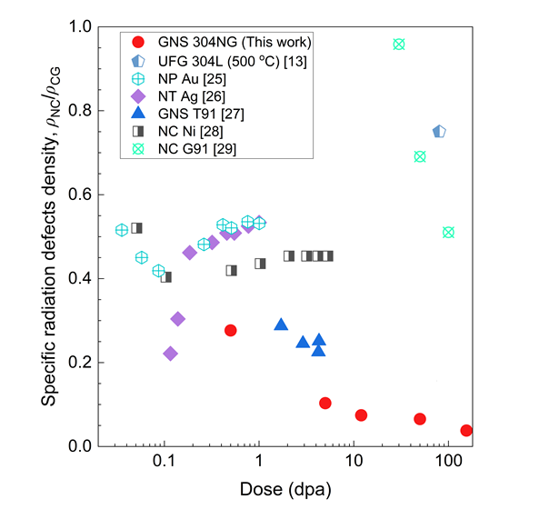 图3. GNS 304NG中高密度层错与辐照缺陷相互作用,发生自适应马氏体相变