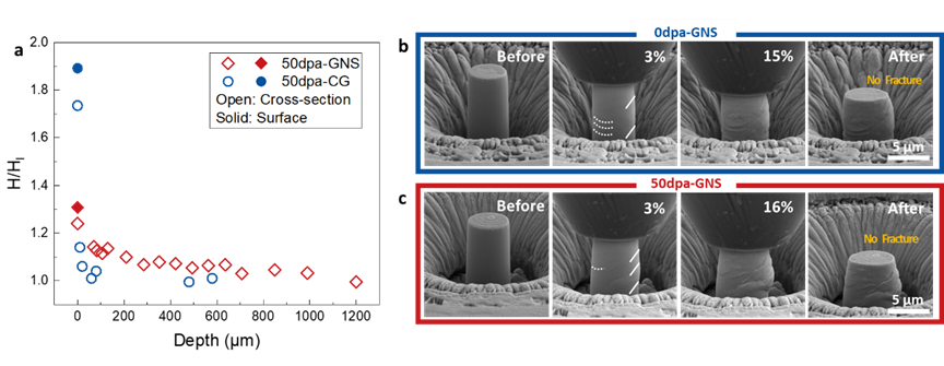 研究团队通过表面纳米化技术在广泛应用于核反应堆的304NG中制备了由高密度层错、低能界面和位错网络等结构特征组成的纳米结构(GNS 304NG,图1),使得该材料具有优异的抗辐照能力(图2)。例如,在室温超高剂量(155 dpa)辐照后,GNS 304NG样品中的辐照缺陷密度和尺寸仅为粗晶样品中的3.8%和63%;在高温(450 °C)辐照时GNS 304NG样品也同样表现出比粗晶样品更为优异的抗辐照性能。结合微观结构表征和分子动力学模拟(图3),研究团队发现,GNS 304NG优异的抗辐照性能与辐照诱发的自适应马氏体相变密切相关:辐照缺陷与材料中预制的层错相互作用而诱发马氏体相变,加速辐照缺陷的消失;此外,高密度层错还促使马氏体相向周围不断拓展,在加速消耗辐照缺陷的同时形成连续分布的马氏体相。进一步的微纳力学实验证实,GNS 304NG中大规模的自适应马氏体相变不会造成材料力学性能的恶化(图4),将传统上辐照诱发马氏体相变造成材料脆化这一有害过程转变为一个有益的过程。由于自适应马氏体相变机制在从低剂量到极高剂量、从低温到高温的辐照下均保持有效,加之所采用的表面纳米化技术具有低成本和工业上易于实现的特点,本工作表明,将表面纳米化技术与自适应马氏体相变结合,可为现行及未来核设施提供一种大幅提升抗辐照能力的策略,应用于奥氏体不锈钢及钛合金等在辐照下可发生马氏体转变的金属材料中。