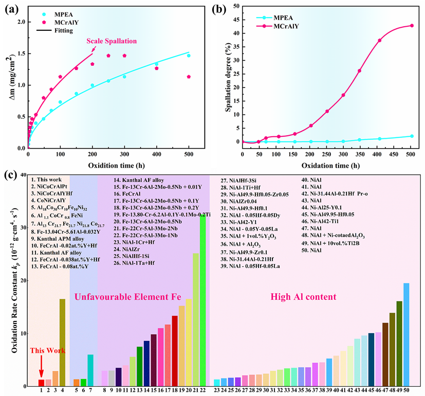 基于上述策略,团队成功研制出新型NiCoCrAlYHf多主元合金(Multi-Principal Element Alloy, MPEA)。在 1200℃、500 小时的等温氧化实验中,新型合金的氧化增重显著低于传统合金,其氧化速率常数仅为 1.28×10⁻¹² g²·cm⁻⁴·s⁻¹,比传统合金低约 59%。更为重要的是,在循环氧化测试中,传统合金在 70 小时后就出现氧化膜剥落,500 小时后剥落面积超过 40%,而新型合金在整个测试周期内剥落面积小于 2%,展现出卓越的膜层结合力与抗剥落性能。这一进展为发展下一代能在极端温度下稳定服役的热障涂层粘结层材料,奠定了关键的材料基础与设计范式。