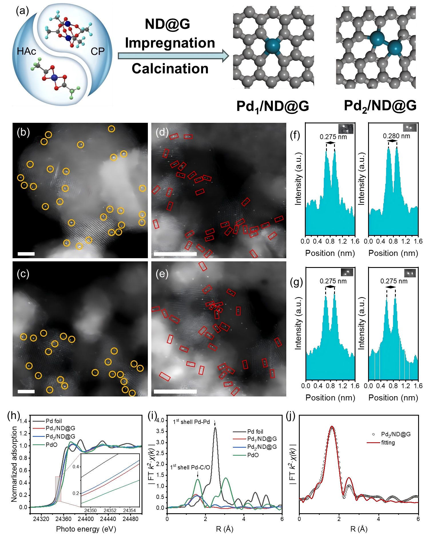 图1.催化剂结构表征。(a)合成示意图, (b-f)HAADF-STEM图像及相应的线性强度分析,(h)Pd K-边进步吸收谱,(i-h)Pd扩展边光谱及其拟合。