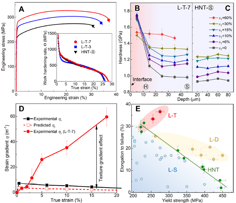 这一发现是本团队继揭示双梯度纳米孪晶结构额外强化与应变硬化效应(Science 2018)之后的又一次重要突破,表明在既有梯度基础上引入织构梯度,可延长梯度变形阶段,显著提升应变硬化与延伸率,从而有效打破强度与延伸率之间的倒置困境。该成果进一步丰富了基元序构金属强韧化的设计策略与力学原理,为发展下一代高性能金属结构材料提供了具有普适性的设计准则。