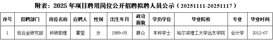 现对拟聘人员进行公示,公示期为5个工作日,自2025年11月11日起至2025年11月17日止。在公示期内,如对拟聘人员有异议,可通过电话、电子邮件或书面材料等形式向所人事人才部反映,反映情况应实事求是,一般应署真实姓名。