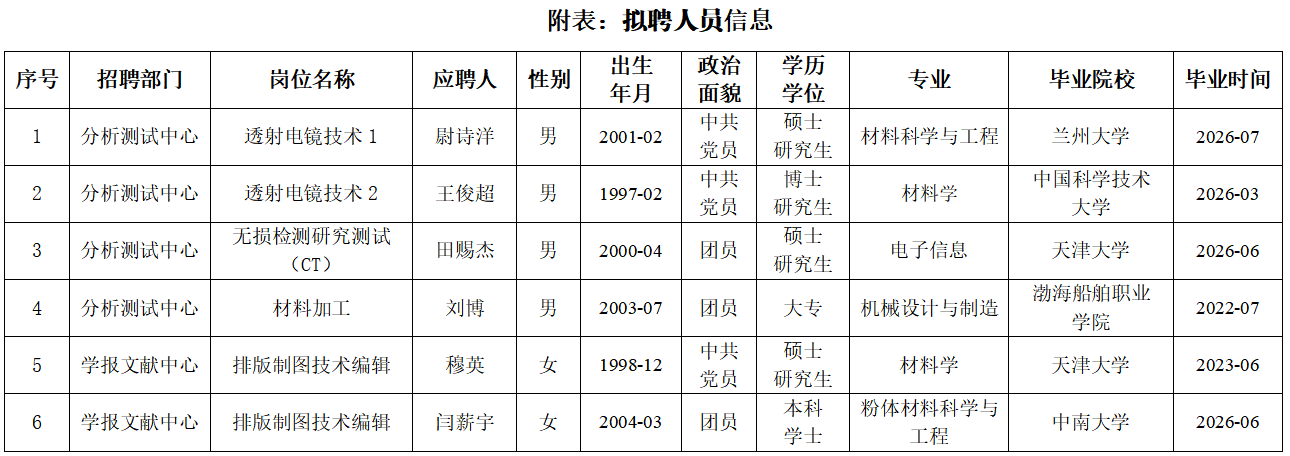 金属所2025年秋季职能部门公开招聘拟聘人员公示