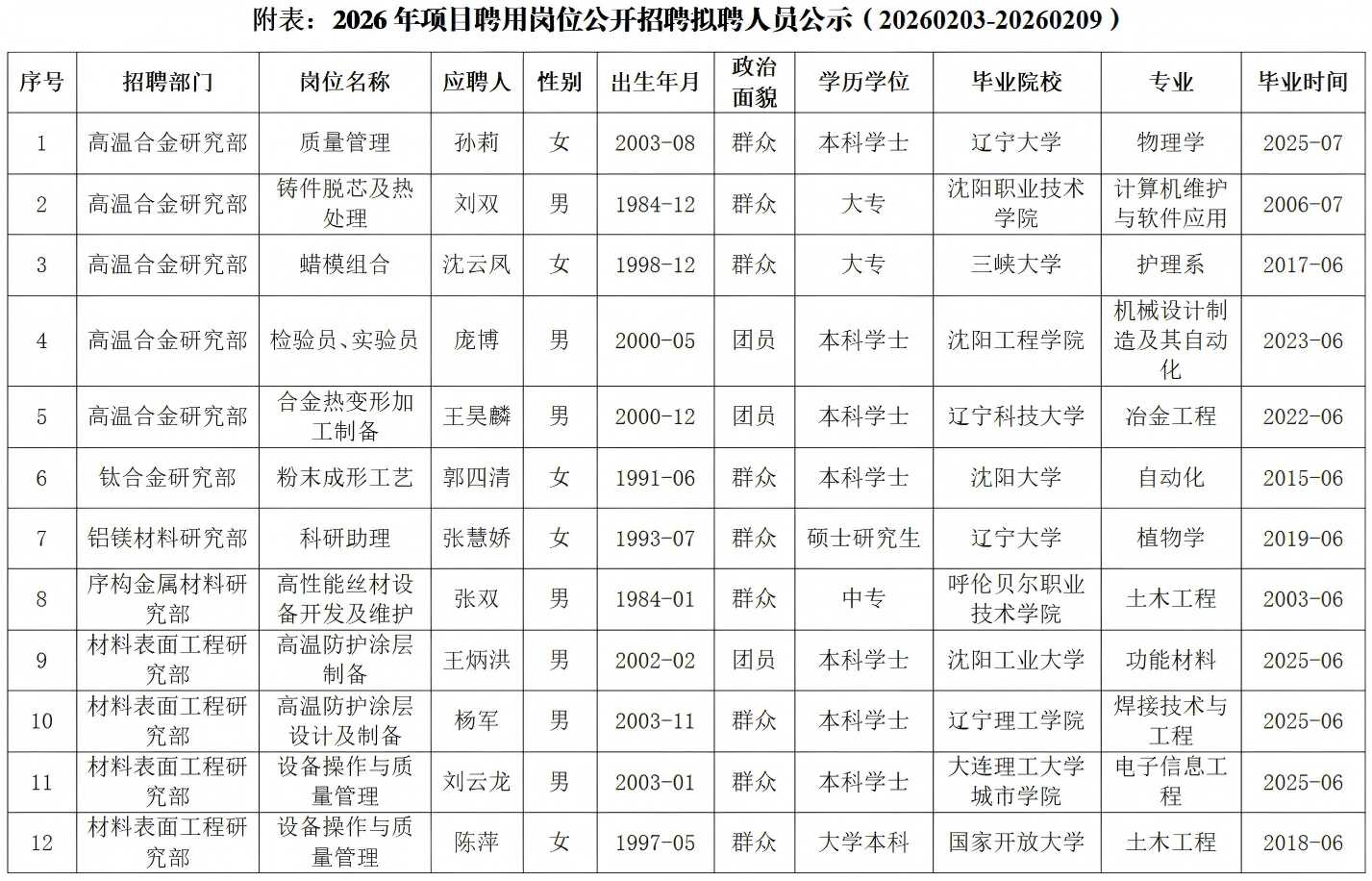 本次公开招聘涉及5个部门的12个岗位,共产生12名拟聘人员(详见附表)。