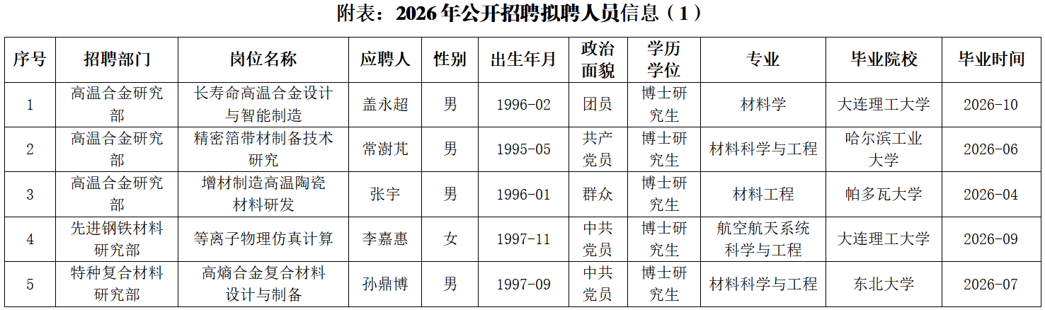 本次公开招聘涉及3个科研部门招聘的5个岗位,共产生5名拟聘人员(详见附表)。