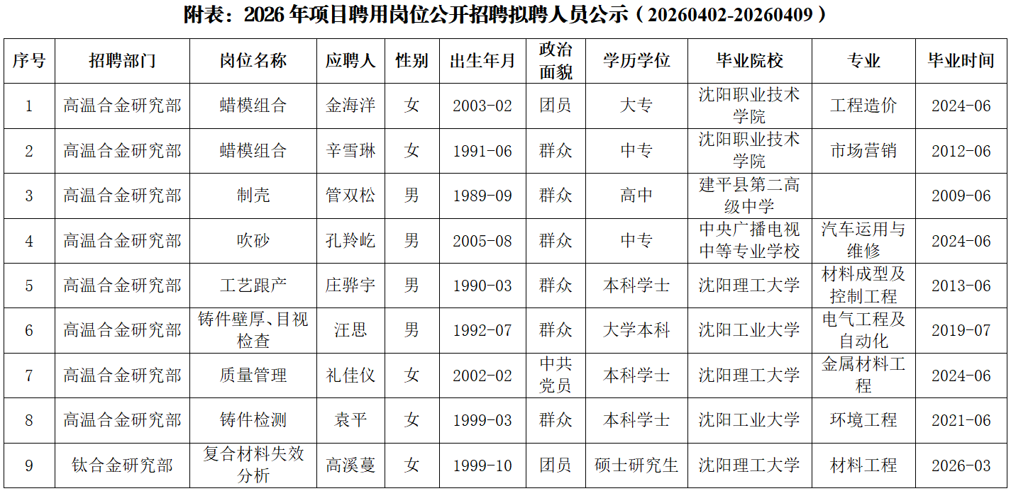 现对拟聘人员进行公示,公示期为5个工作日,自2026年4月2日起至2026年4月9日止。在公示期内,如对拟聘人员有异议,可通过电话、电子邮件或书面材料等形式向所人事人才部反映,反映情况应实事求是,一般应署真实姓名。