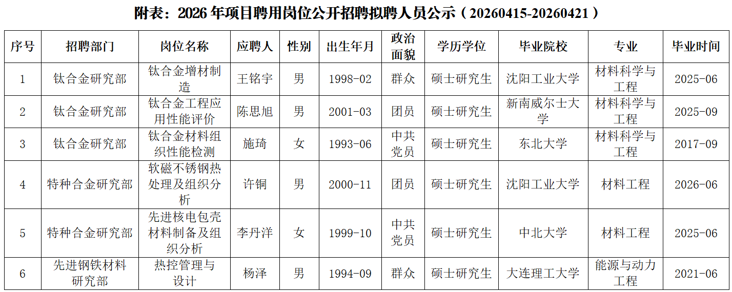 现对拟聘人员进行公示,公示期为5个工作日,自2026年4月15日起至2026年4月21日止。在公示期内,如对拟聘人员有异议,可通过电话、电子邮件或书面材料等形式向所人事人才部反映,反映情况应实事求是,一般应署真实姓名。