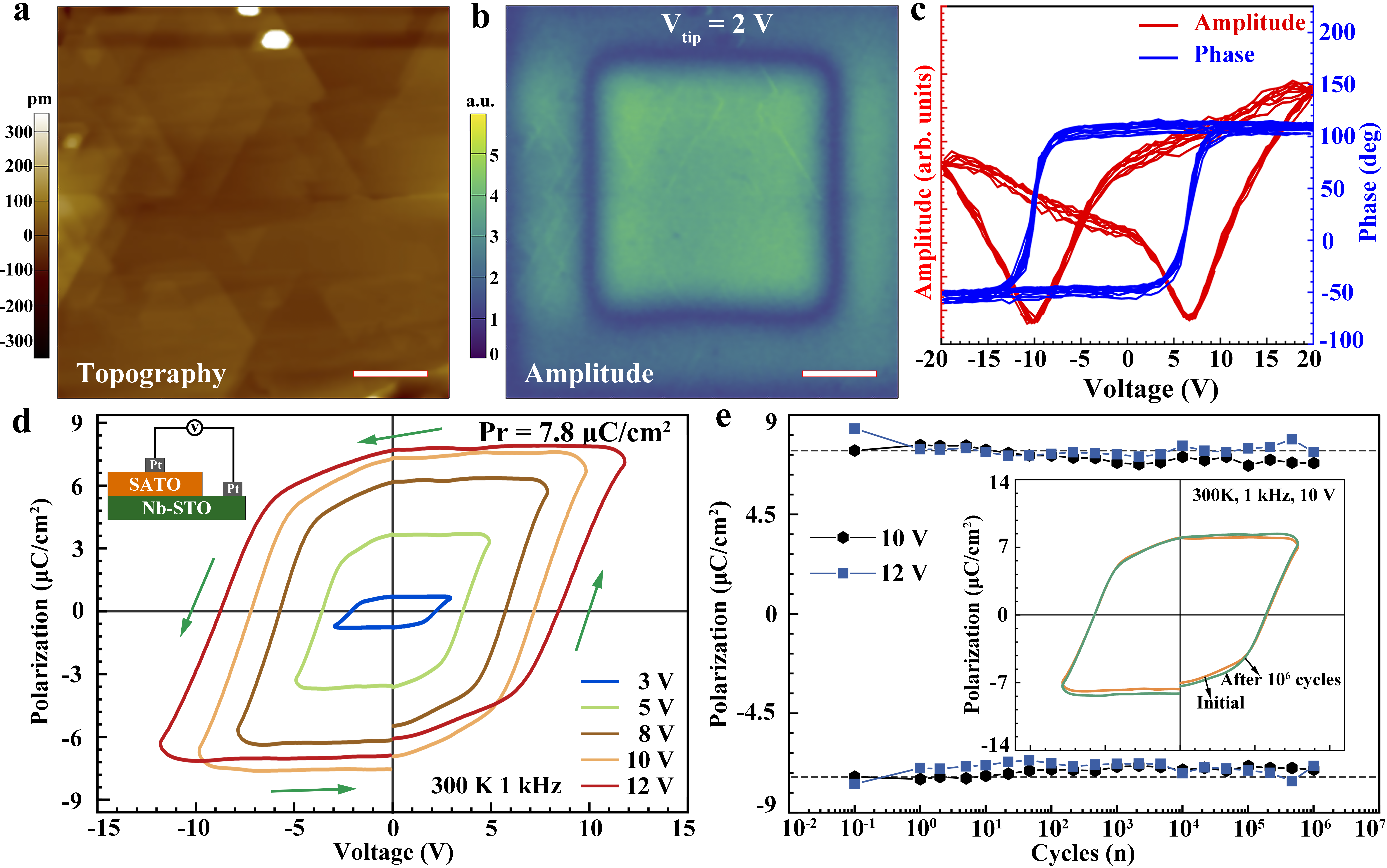 图4、SATO薄膜的铁电性能。(a-c) PFM振幅与相位图显示了清晰的铁电翻转特性。(d)通过PUND方法测得的电滞回线,证实SATO薄膜的铁电性是本征的。SATO薄膜具有高达7.8 μC/c㎡剩余极化和优异的疲劳性能。标尺为2 μm。