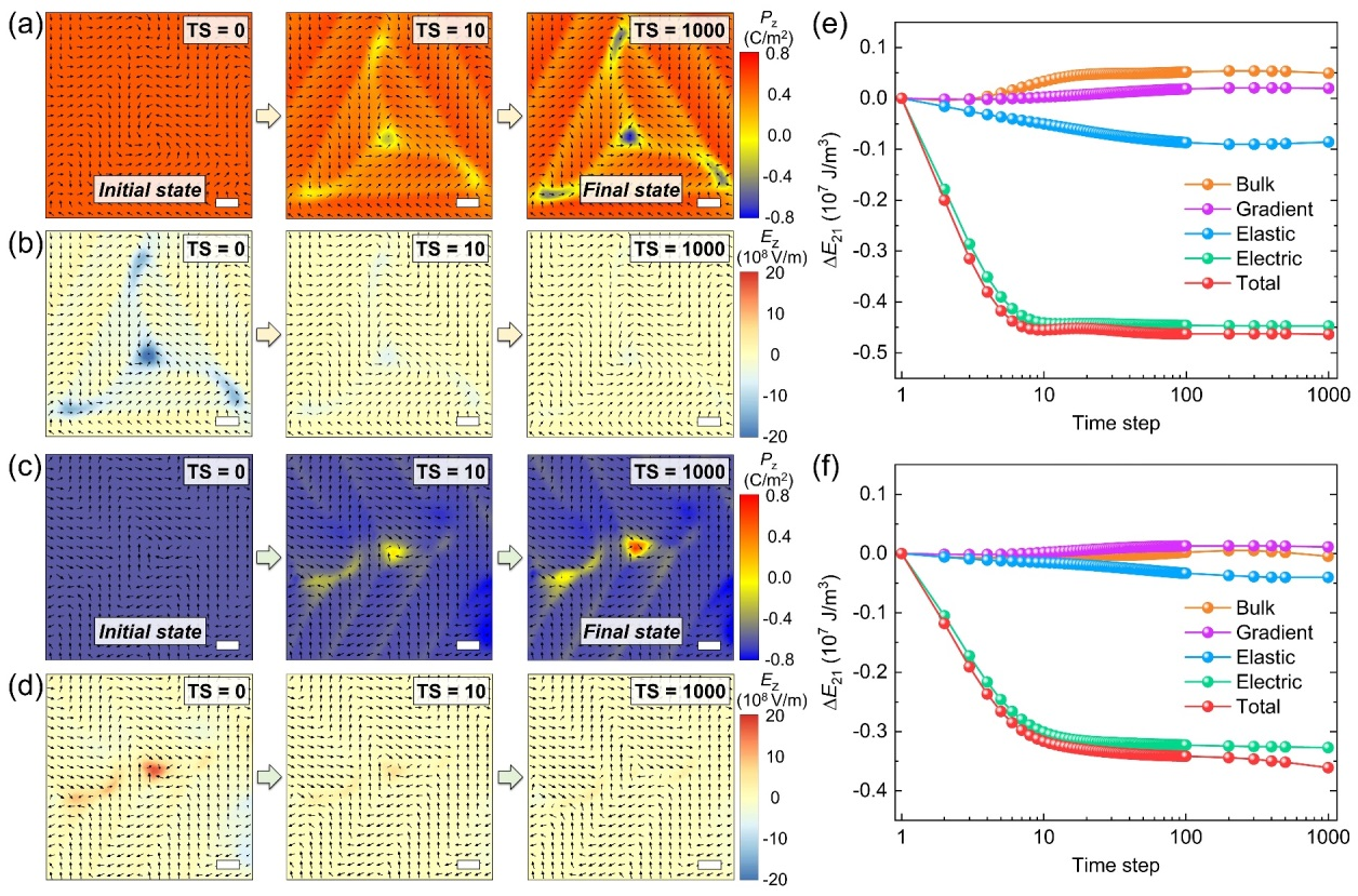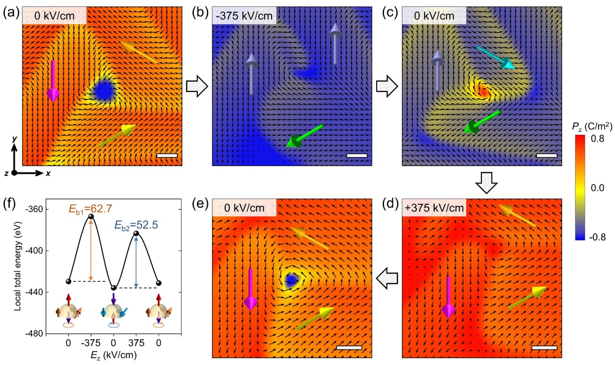 进一步研究表明,单个极性浮子可表现出八种不同的拓扑态,其差异来源于面内极化旋向(顺时针/逆时针)、面外极化方向(向上/向下)以及其位于薄膜中的位置(上表面/下表面)的不同构型组合。所有八种态在相同外界条件下均表现出良好的稳定性,突破了传统铁电存储中二进制(0/1)编码的限制,为实现高密度、多态非易失性存储提供了新的物理载体。相场模拟还揭示了极性浮子的形成机制:该结构在外延应变和电边界条件约束下经多种变体畴协同竞争产生,并在体系静电驱动力作用下稳定。计算还表明,不同极化浮子态之间可在外电场下实现可逆的低能切换,显示出良好的器件应用潜力。