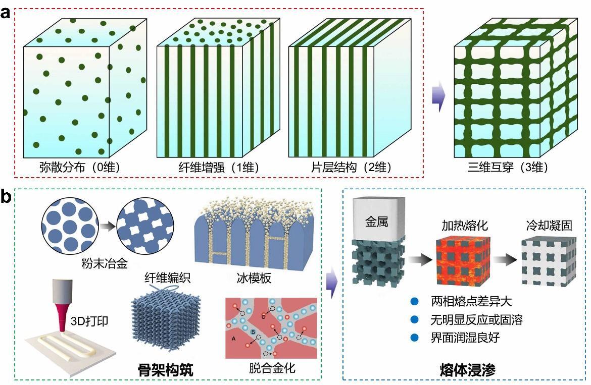 近期,金属研究所材料疲劳与断裂研究部张哲峰研究员团队成员刘增乾研究员联合所内铝镁合金、特种复合材料、钛合金等研究部以及北京航空航天大学、山东大学、中国医科大学、加州大学伯克利分校等开展系列合作研究,在揭示生物材料多尺度结构特征及其强韧机理的基础上,提炼出多尺度、三维互穿等仿生结构设计关键要素,阐明了仿生结构在提升材料综合性能方面的作用机制,为高性能仿生材料设计提供了理论依据。针对复杂仿生结构在人造材料中构筑难度大、可控性不足的问题,提出了“骨架构筑+熔体浸渗”的两步法制备策略(图1),并研发出相应的金属基仿生材料制备技术,通过将微观结构构建与材料整体成型有效解耦,为复杂仿生结构在金属材料中的构筑提供了可行的技术路径。