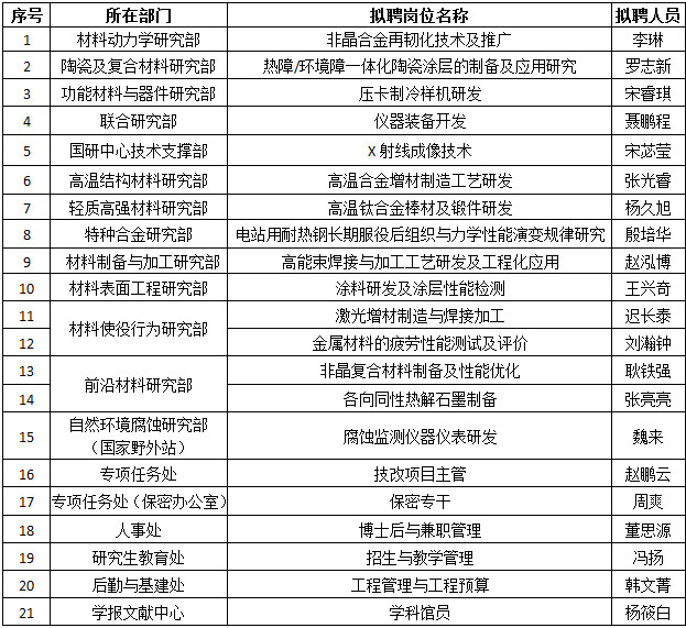 经部门申请及所务会议批准设岗、个人报名、人事处资格审查、事业编制岗位聘用委员会评议、所党委会议审议、所务会议研究通过,2022年度科金项目聘用人员竞聘事业编制岗位拟聘用人员情况如下: