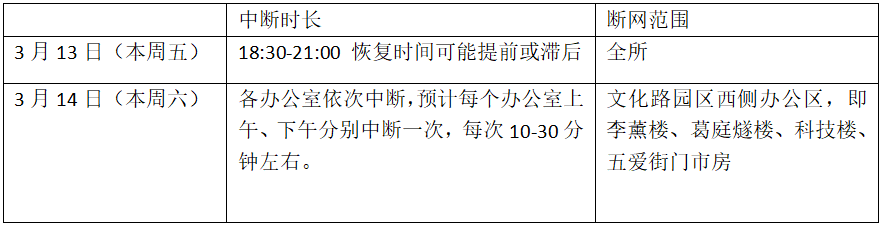 因我所进行网络设备的全面升级,本周末将中断网络,具体安排如下: