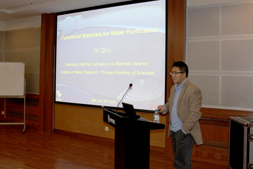 王心晨教授首先为金属所青年职工和研究生作了题目为“聚合物半导体光催化材料及其性能”的专题报告,详细介绍了其发现g-C3N4光催化材料的过程,以及如何从形貌、结构、组分三方面设计性能更优的g-C3N4基光催化材料,同时展望了g-C3N4基光催化材料的发展趋势。随后,李琦研究员以“应用于净水处理的环境修复型功能材料”为主题,介绍了环境修复型净水功能材料,并重点讲解了Mg掺杂的Fe2O3纳米颗粒在除砷方面的优异性能、机制以及有记忆效应的Pd修饰的氮掺杂TiO2光催化材料。报告结束后,青年职工和研究生与报告人开展了积极交流互动,活动现场气氛热烈。