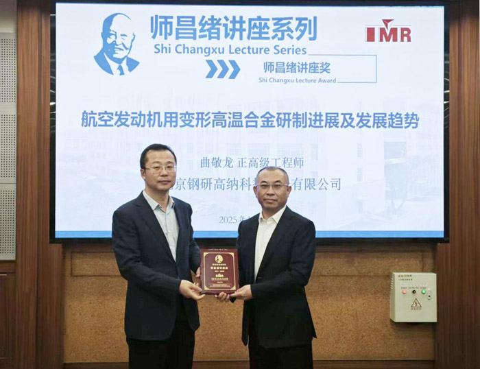应中国科学院金属研究所邀请,10月17日,北京钢研高纳科技股份有限公司副总经理、正高级工程师曲敬龙来所作师昌绪讲座报告。报告前刘岗所长向曲敬龙颁发了师昌绪讲座奖奖牌。